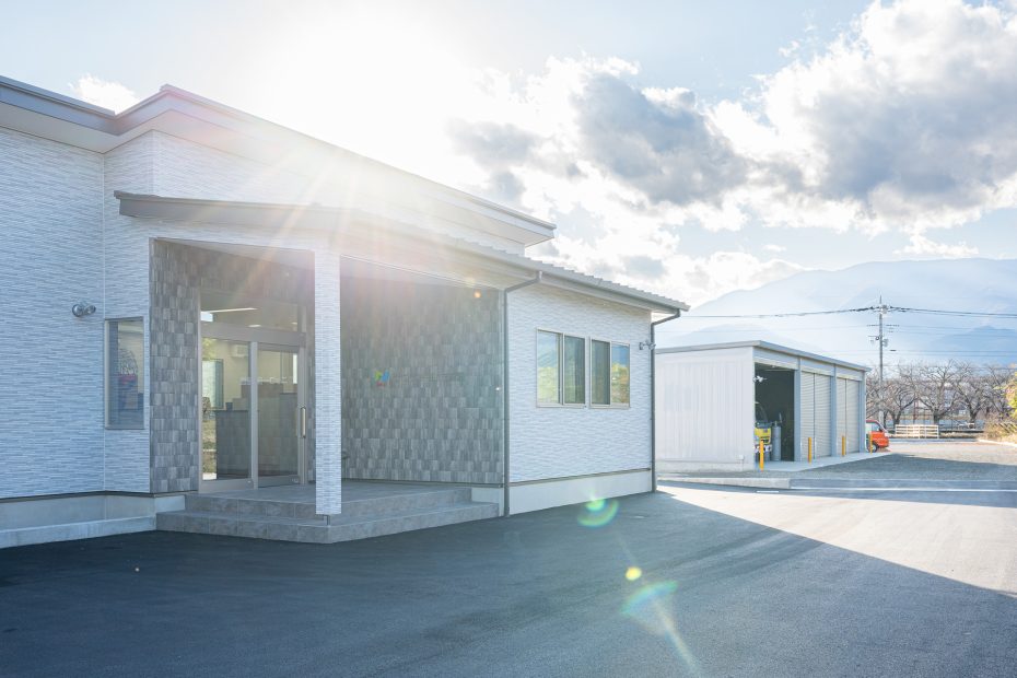 ミニマルな事務所棟。自然豊かな立地なので窓は大きく、明るいオフィスになりました。