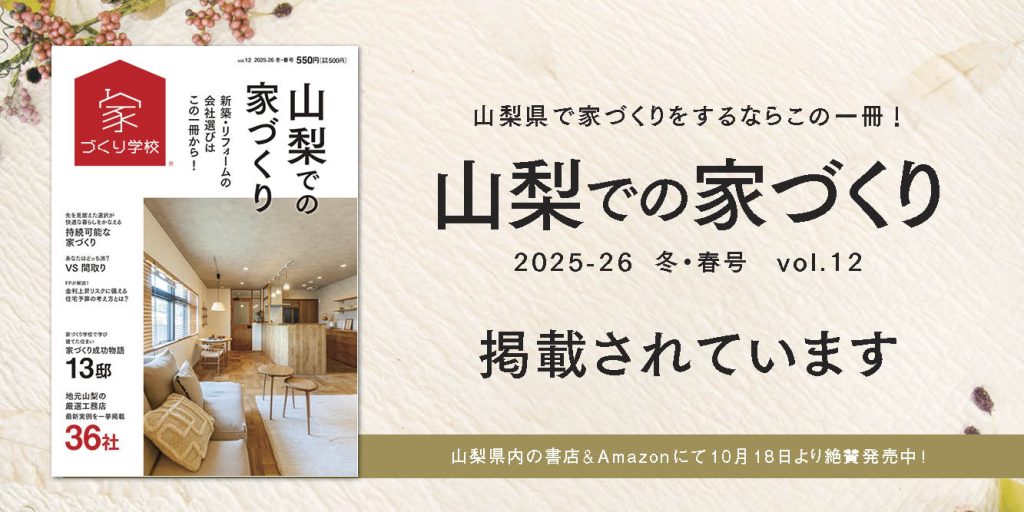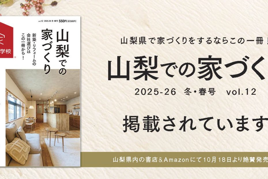 ホーム » 山梨での家づくりVol,12が発売中です。山梨での家づくりVol,12が発売中です。by マツダ建築工房2025.10.20 家づくり学校様より、素敵なバナー画像を作成して頂きました。 感謝です。 家づくり学校様から発行しております「山梨での家づくりVol,12」が絶賛発売中です。