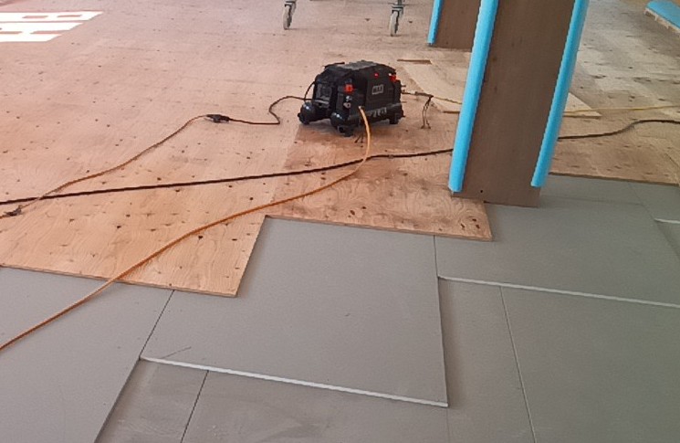 二階の床全体に二重の遮音ボードを施工し、それを覆うようにベニヤを敷きました。今週からはさらにこの上にOAフロアーや置床を施工することで床に仕上げ材を施工できる状態まで進みます(山)